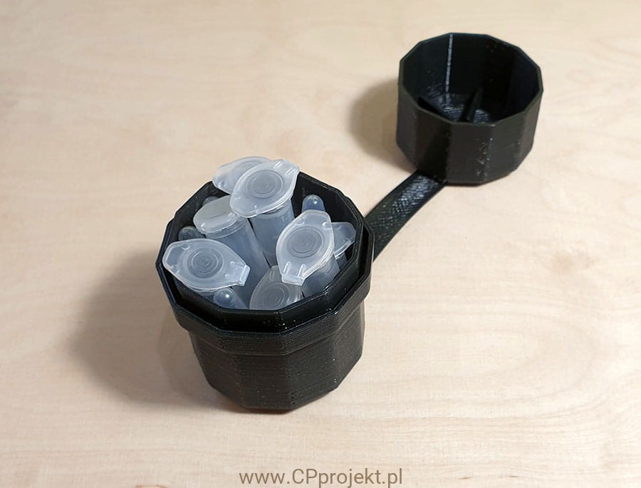 Specjalne wyżłobienie na zewnątrz pojemnika umożliwia jego obwiązanie bądź spięcie opaską bez ryzyka jej zsunięcia się.