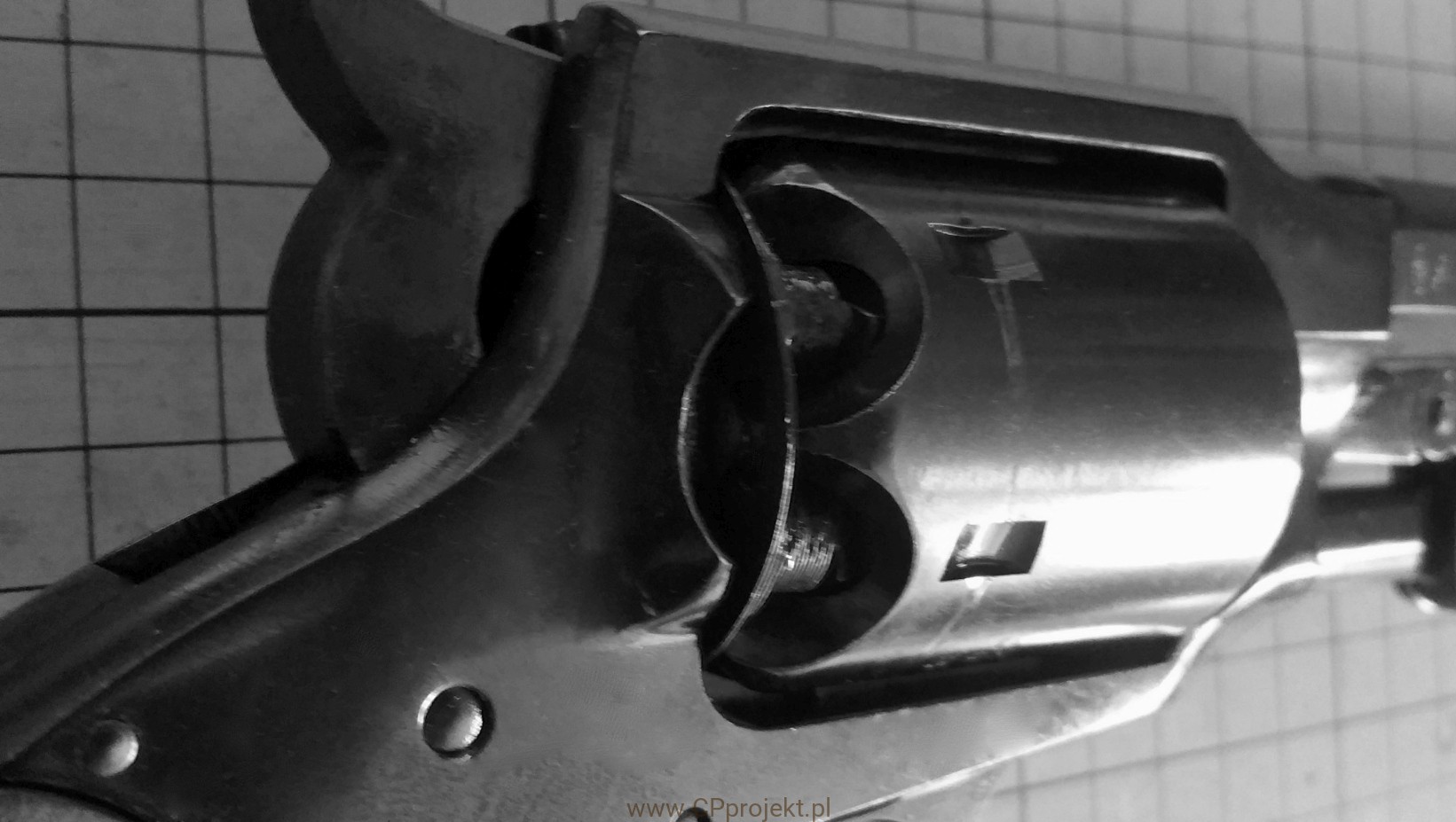 Osłonę zakładamy na kominki wyjętego bębna. Tak zabezpieczony bęben wkładamy do rewolweru i możemy bezpiecznie ściągnąć spust bez obawy, że opadający kurek uszkodzi nam kominki.