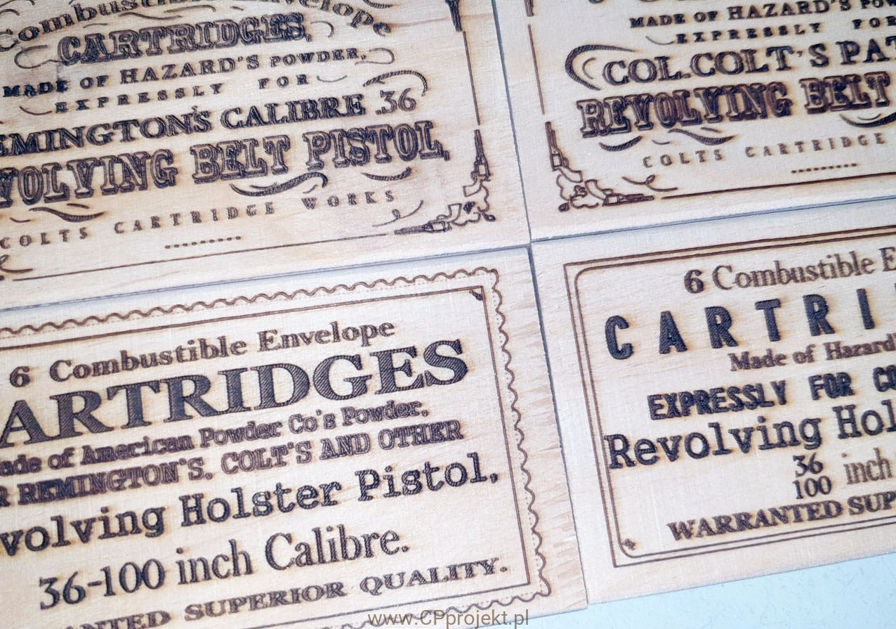 Cztery różne grawery historycznych etykiet.